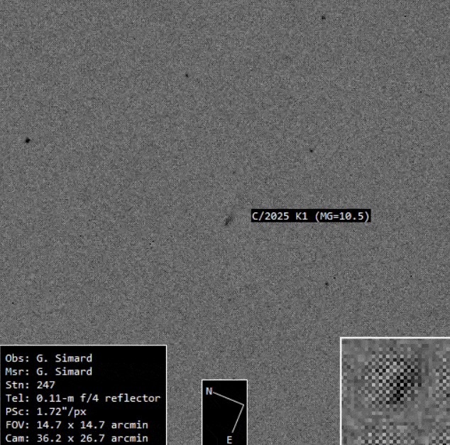 Georges Simard, en Floride depuis peu, a pointé son télescope vers la comète C/2025 K1 (ATLAS). Malgré des conditions pas très idéales (comète basse sur l’horizon à moins de 20°, pollution lumineuse d’Orlando et nouveaux lampadaires dans son secteur), il a réussi à capturer une image où la fragmentation du noyau est visible.