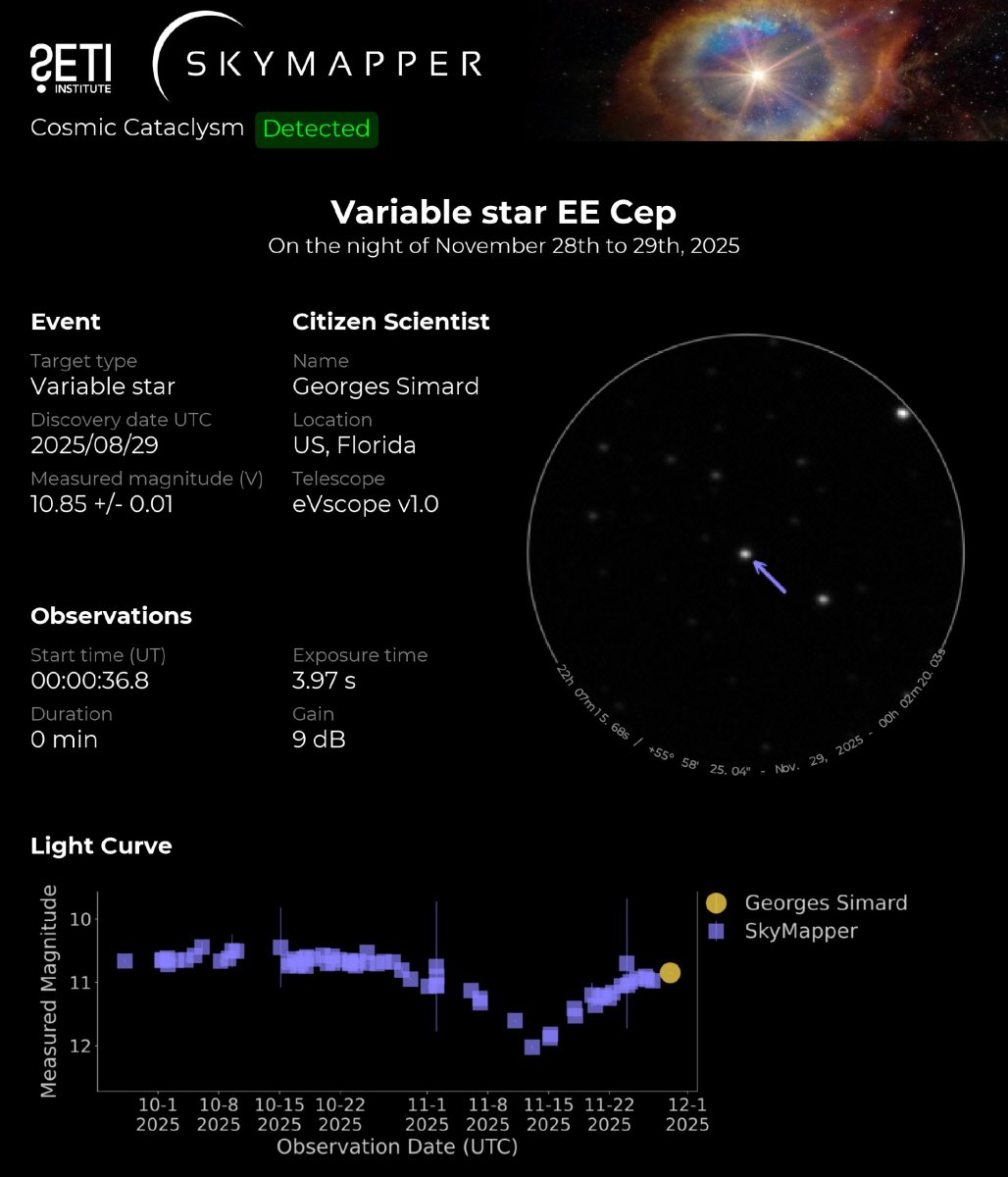 PS: Cette observation fait suite à notre publication du 9 novembre sur l'éclipse de l'étoile EE Cep par un nuage de poussière. Il semble que l'évlipse tire à sa fin car, comme on le voit sur le graphique, la luminosité remonte à son niveau normal.