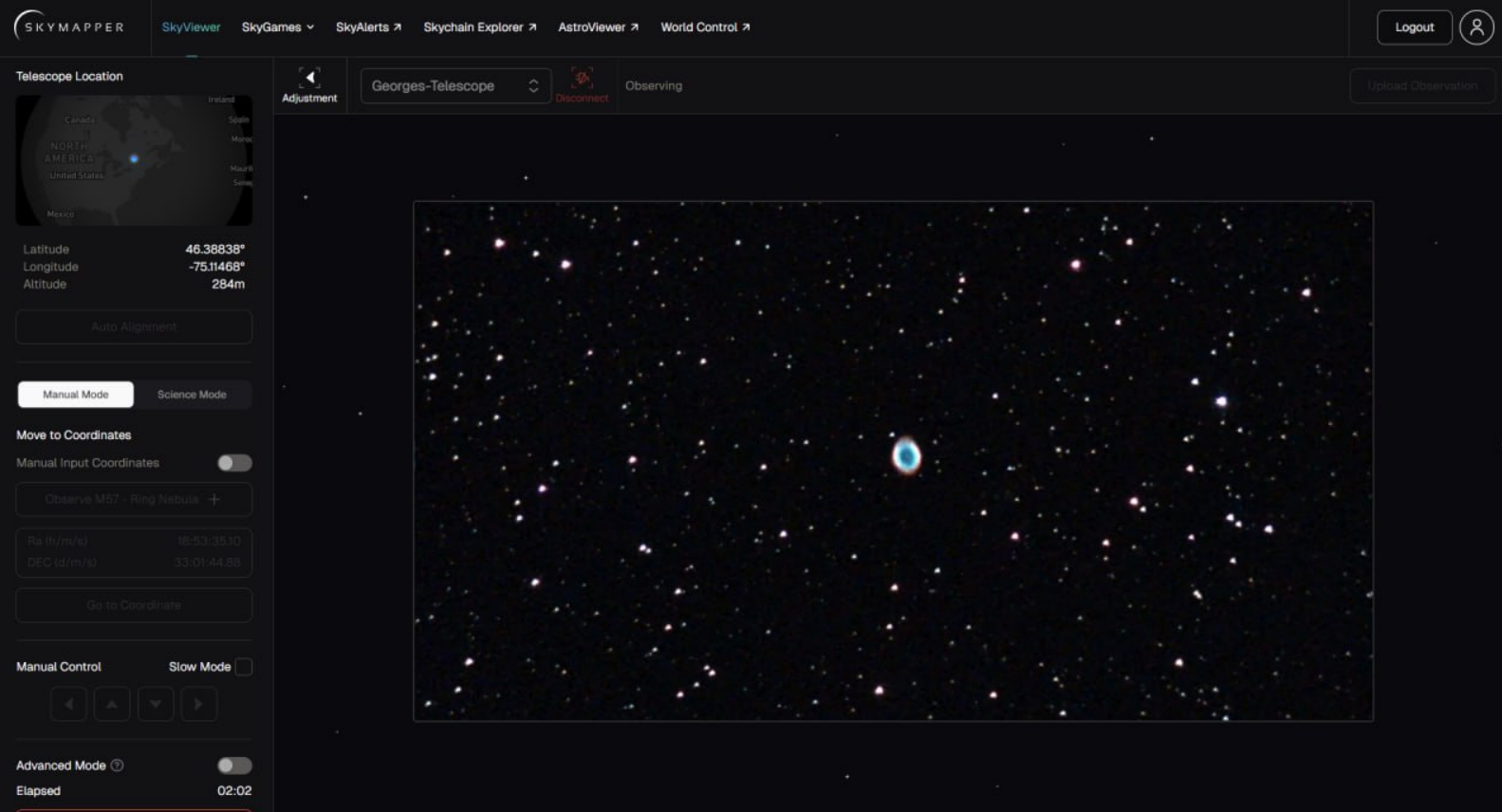 De cette façon, l'utilisateur peut accéder aux autres télescopes de Skymapper pour observer le ciel ou pour faire des observations scientifiques. Ainsi, on peut observer sur un autre télescope lorsqu'il pleut, qu'il y a des nuages ou même en plein jour car il fait toujours nuit quelque part! Les autres utilisateurs peuvent aussi utiliser notre télescope lorsque nous le rendons disponible.