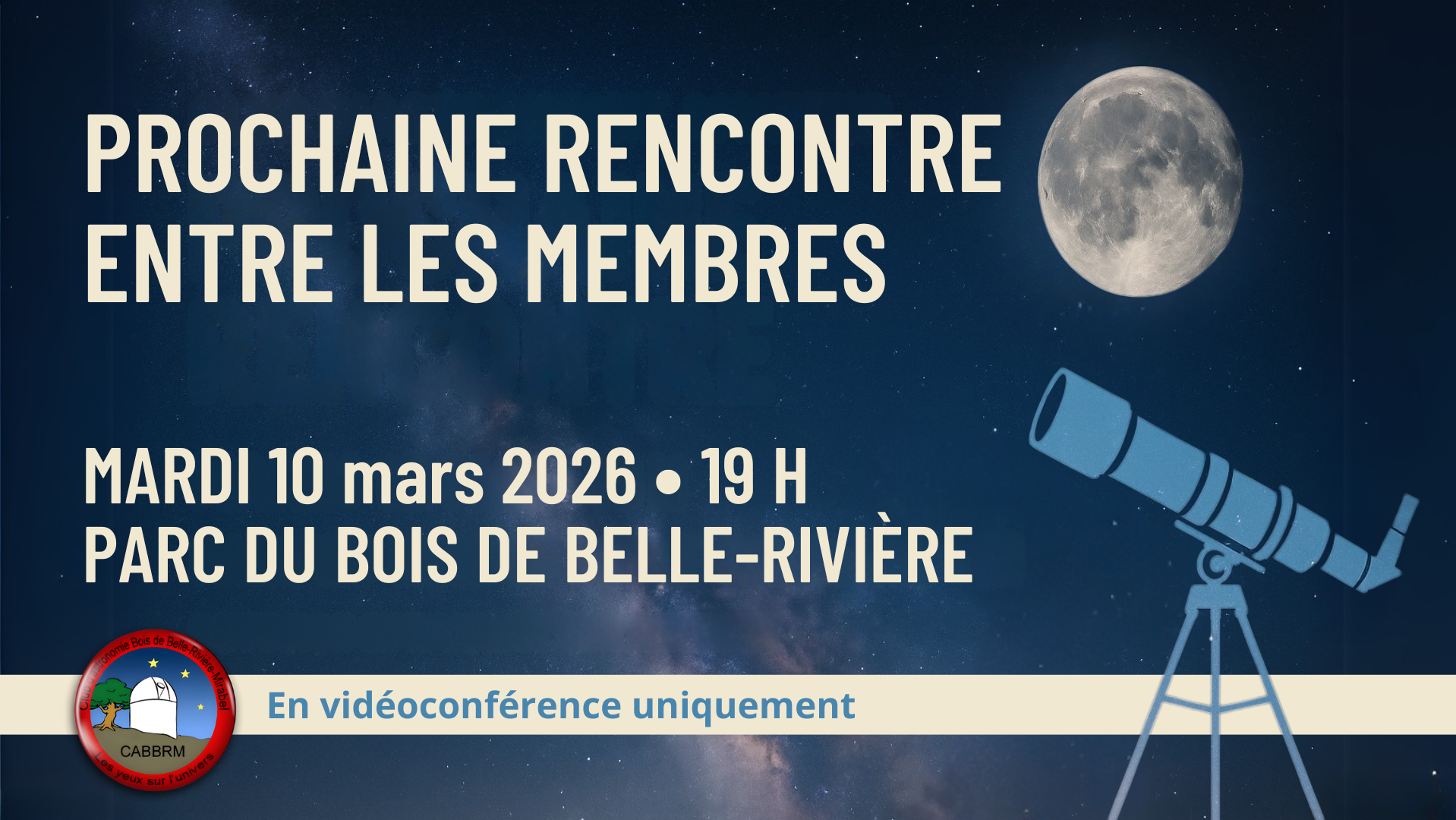 Rejoignez-nous en ligne le mardi 10 mars à 19 h pour notre prochaine rencontre entre les membres du CABBRM! Au programme : les actualités du club, les événements astronomiques du mois, nos projets de science citoyenne et bien d’autres discussions pour nourrir votre curiosité. Nous vous attendons pour une soirée riche en découvertes et en échanges !