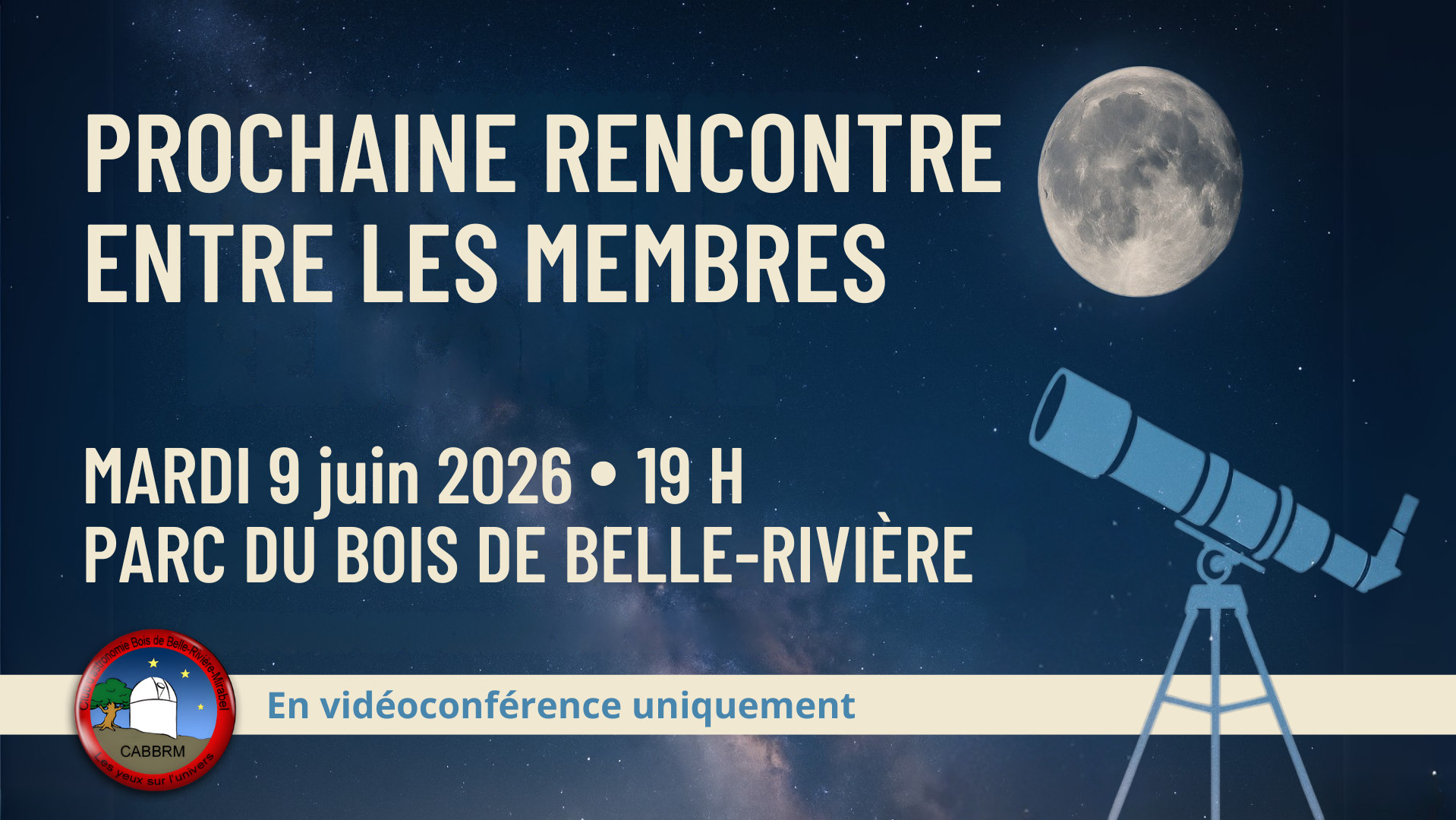 Rejoignez-nous en ligne le mardi 9 juin à 19 h pour notre prochaine rencontre entre les membres du CABBRM! Au programme : les actualités du club, les événements astronomiques du mois, nos projets de science citoyenne et bien d’autres discussions pour nourrir votre curiosité. Nous vous attendons pour une soirée riche en découvertes et en échanges!