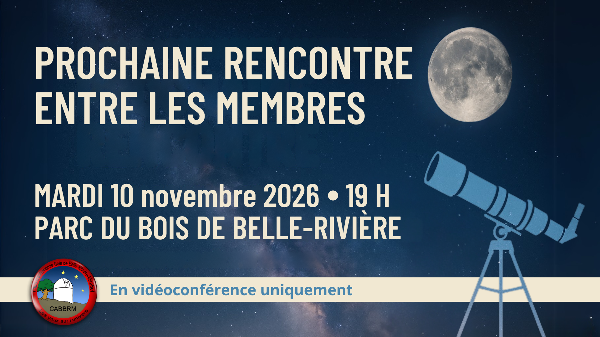 Rejoignez-nous en ligne le mardi 13 octobre à 19 h pour notre prochaine rencontre entre les membres du CABBRM! Au programme : les actualités du club, les événements astronomiques du mois, nos projets de science citoyenne et bien d’autres discussions pour nourrir votre curiosité. Nous vous attendons pour une soirée riche en découvertes et en échanges!