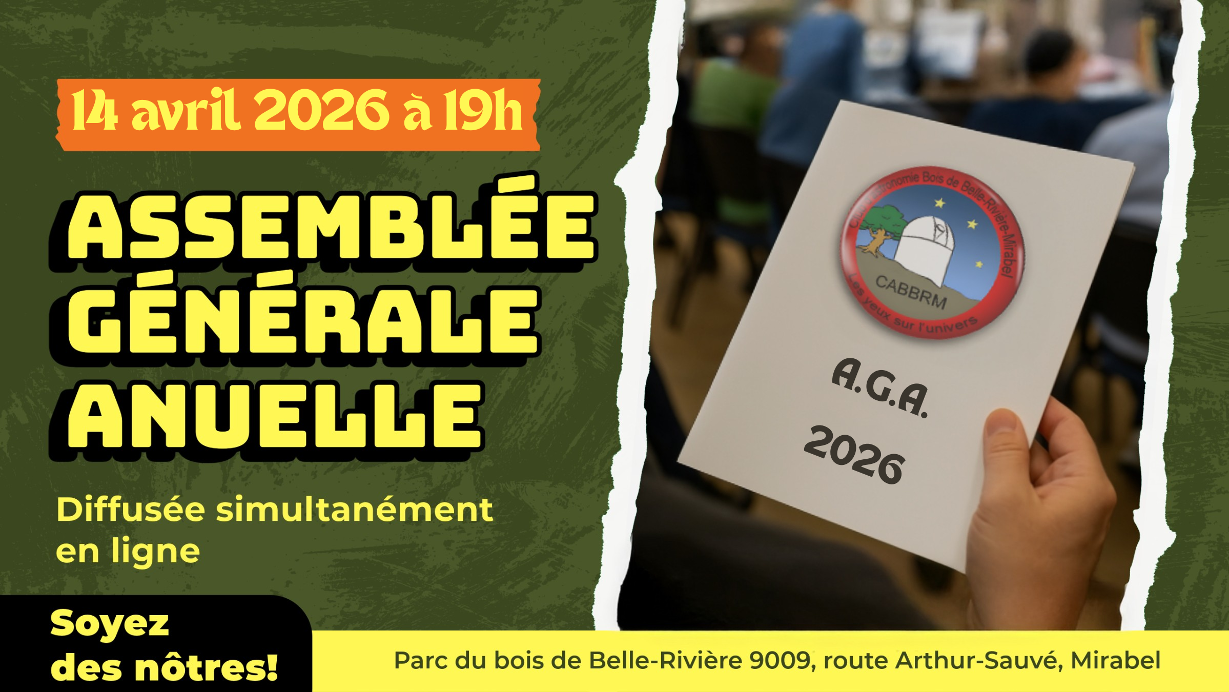 Prenez note que l’assemblée générale annuelle du club se tiendra le mardi 14 avril 2025 à 19h. Vous pourrez y assister en présence au pavillon d'accueil du bois de Belle-Rivière ou par vidéoconférence (voir le lien dans vos courriels).