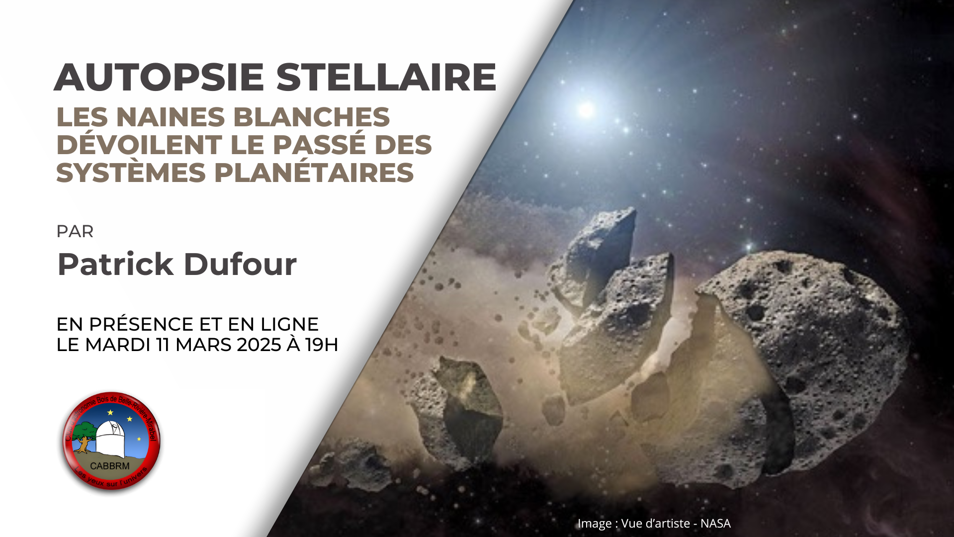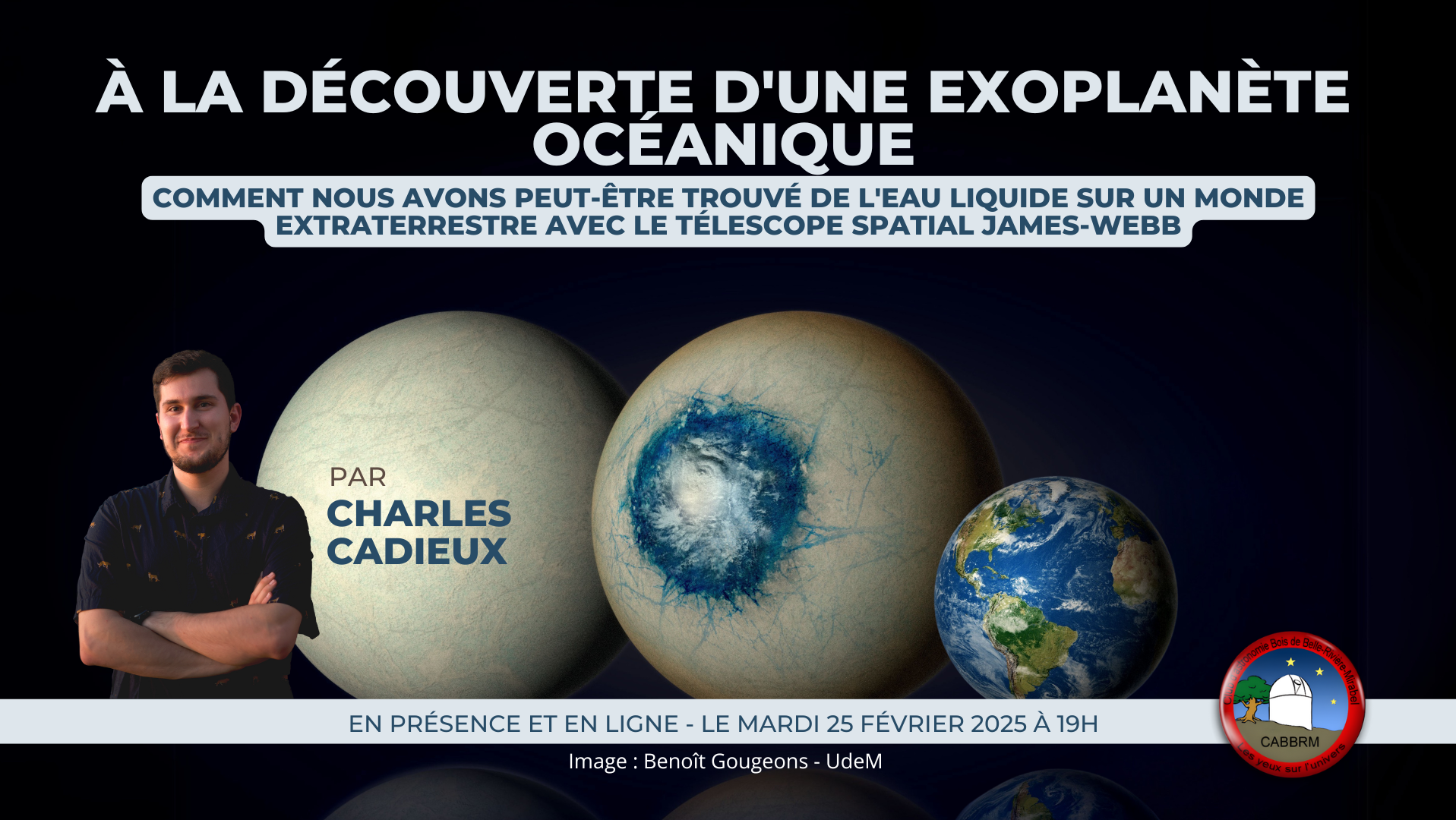 Joignez-vous à nous pour une soirée captivante où Claude Lafleur, Steve Prud'Homme et GalaxieMan passeront en revue les événements les plus marquants de 2024. Chaque présentateur apportera son éclairage unique sur ces événements, avec des images spectaculaires et des analyses enrichissantes. Ne manquez pas cette occasion de revivre une année riche en découvertes cosmiques!