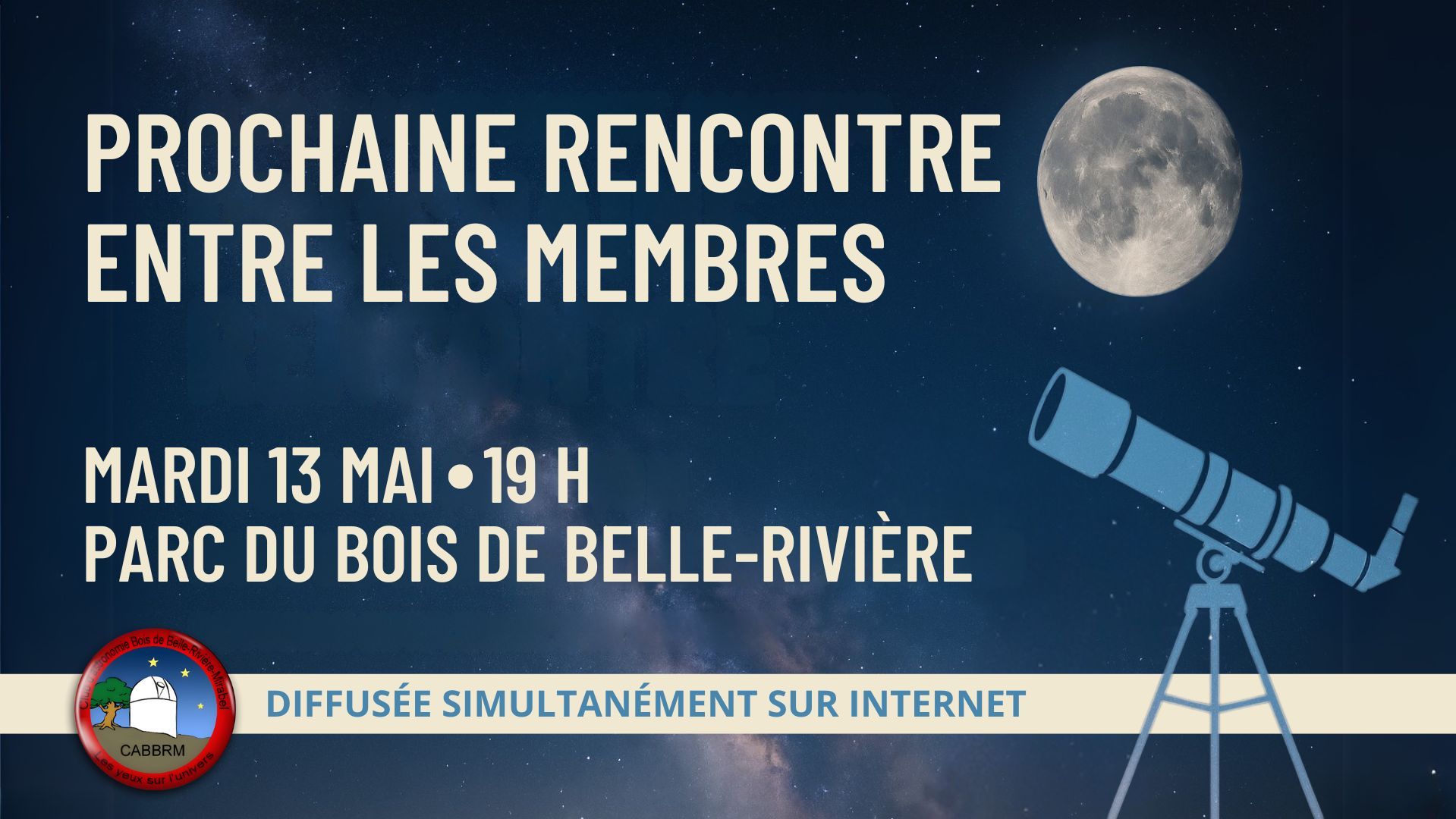 Rejoignez-nous le mardi 13 mai à 19 h au parc du Bois-de-Belle-Rivière pour notre prochaine rencontre entre les membres du CABBRM! Au programme : les actualités du club, les événements astronomiques du mois, nos projets de science citoyenne et bien d’autres discussions pour nourrir votre curiosité. Nous vous attendons pour une soirée riche en découvertes et en échanges !
