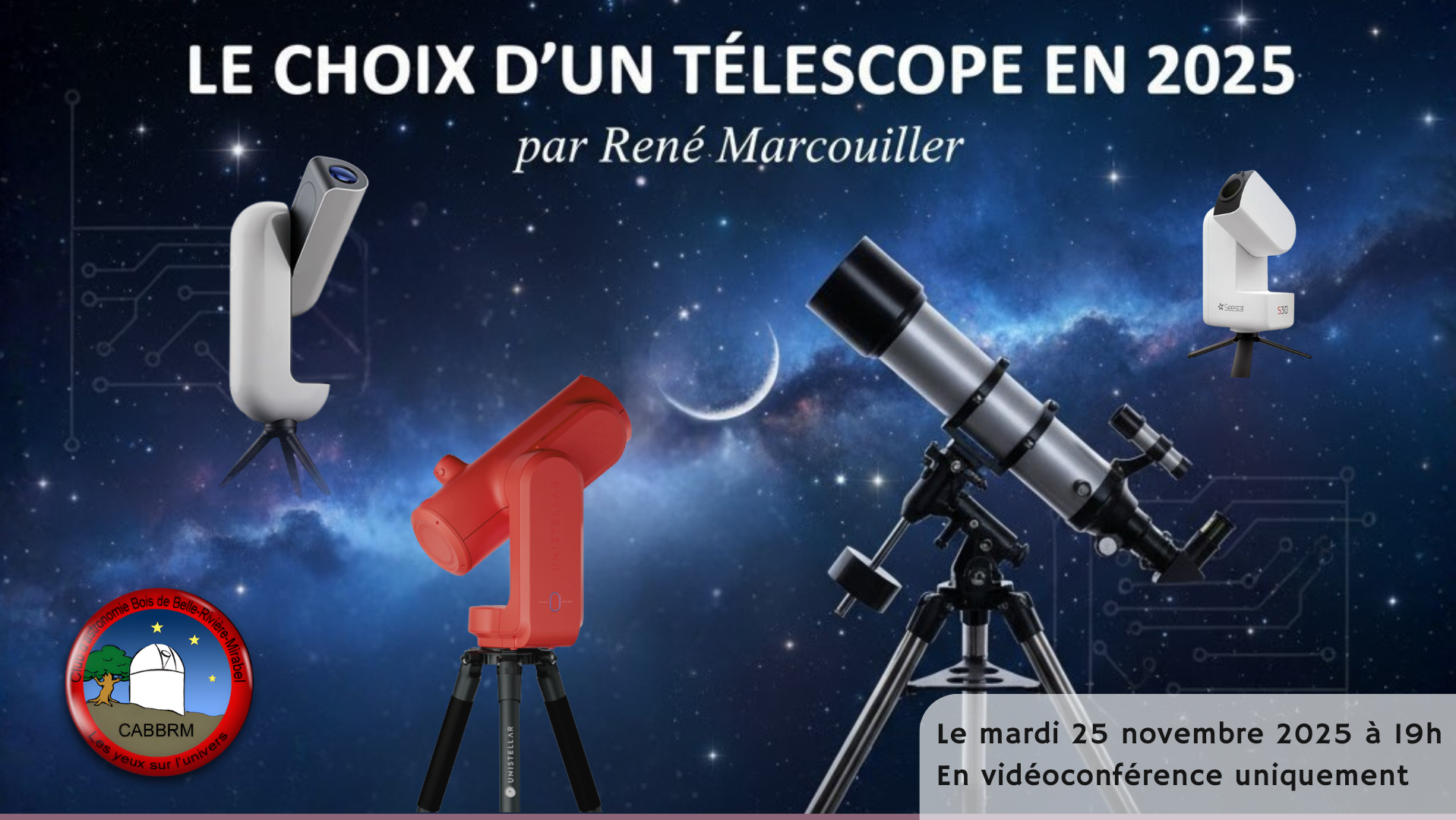 Le monde des télescopes évolue vite ! Entre les instruments classiques, les modèles pour l’astrophotographie et la nouvelle génération de télescopes “intelligents”, il est facile de s’y perdre. Dans cette présentation, nous ferons un survol des grandes catégories d’équipements avant de plonger dans l’univers fascinant des télescopes intelligents : SeeStar, eVscope, Dwarf, Celestron Origin, Vespera… et plus encore ! Un rendez-vous pour mieux comprendre les options d’aujourd’hui et peut-être trouver le télescope qui vous fera lever les yeux plus souvent.