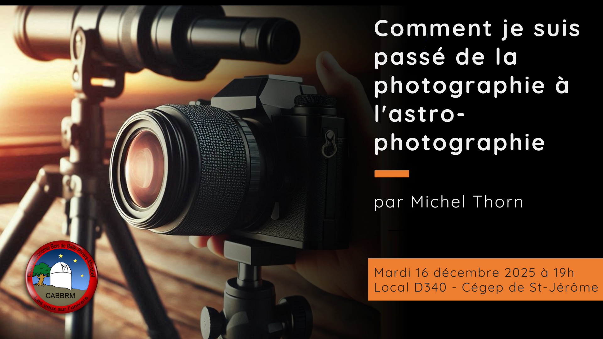 "Il me fera plaisir de vous faire une présentation visuelle sur ma progression en photographie, étape par étape, à partir de ma première caméra, pour ensuite vacillé au travers d’un sentier parsemé de technologies et de logiciels, franchissant les obstacles et découvrant de nouveaux horizons, et en arriver à une passion renouvelée : l’astrophotographie."De la caméra à la lunette astronomique, chaque étape m’a offert son lot de défis, mais surtout de plaisir et d’émerveillement."
