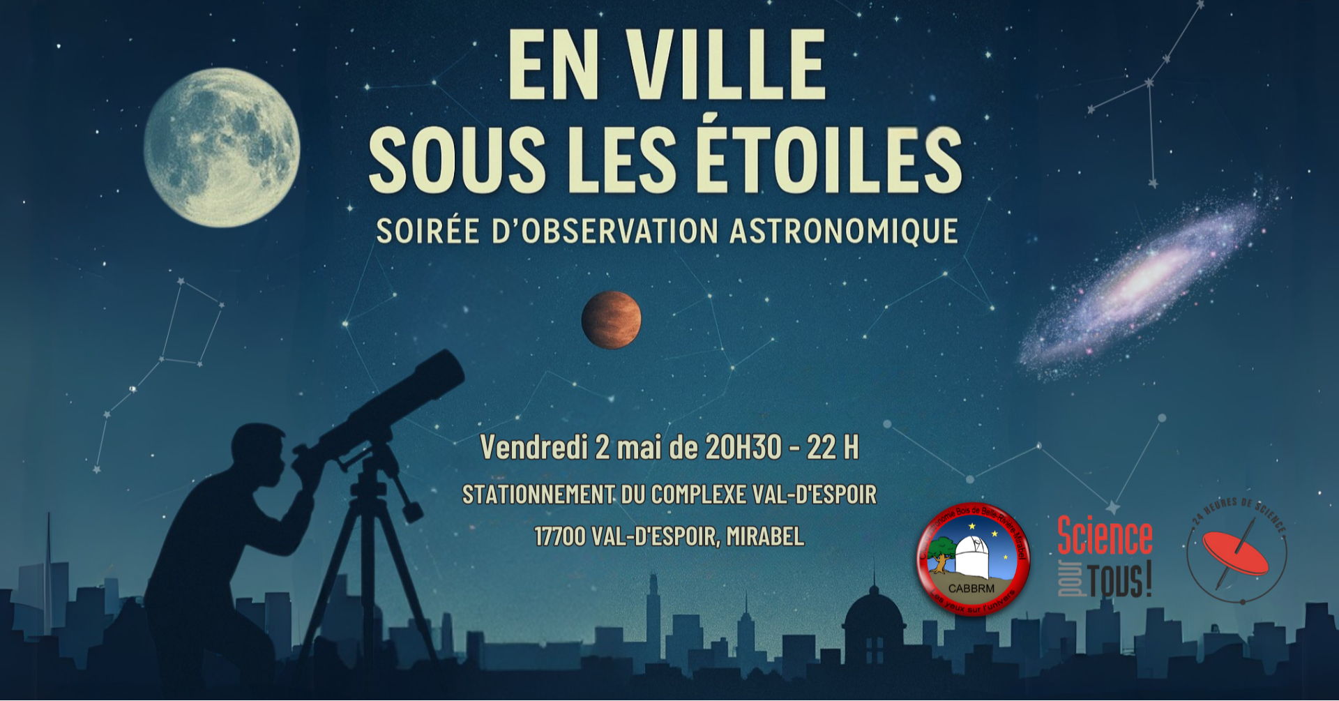 Le ciel vous attend, même en plein cœur de la ville ! Lors de cette soirée d’observation astronomique, explorez la Lune, Mars et Jupiter à travers des télescopes électroniques, découvrez des galaxies lointaines et des amas d’étoiles et repartez même avec vos propres images célestes à télécharger sur votre cellulaire. Nos passionnés d’astronomie seront sur place pour répondre à vos questions, partager leurs connaissances et vous aider à repérer les constellations au-dessus de vos têtes. Une activité gratuite, interactive et inspirante, accessible à tous les âges — parce que la science, c’est aussi la tête dans les étoiles !